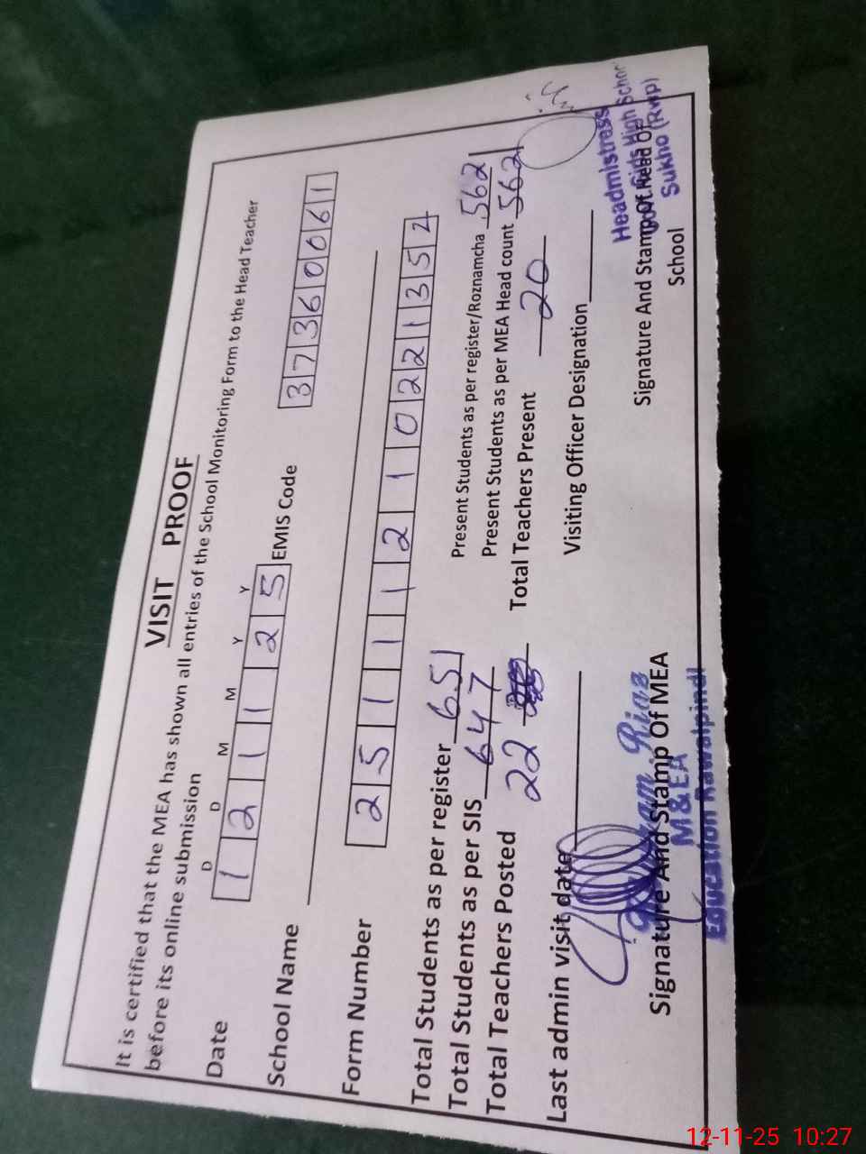 | Attendance Register | Head Teacher | MEA with School | Visit Proof |