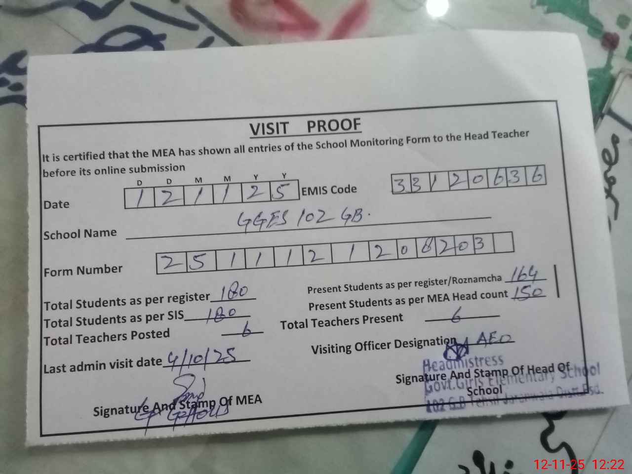| Attendance Register | Head Teacher | MEA with School | Visit Proof |