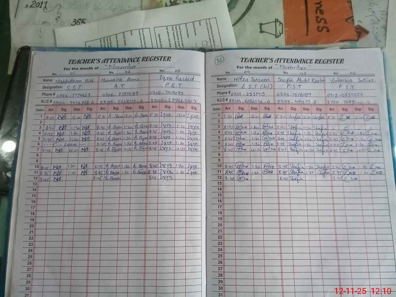 | CNIC | Full Name | Designation | R/C | Absence During Last Calender Month |