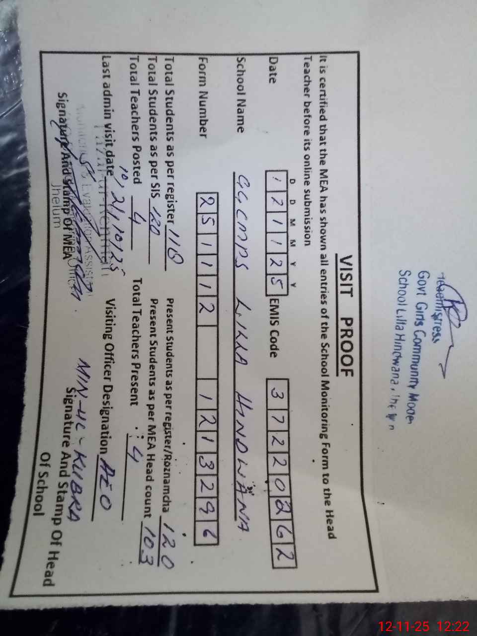 | Attendance Register | Head Teacher | MEA with School | Visit Proof |