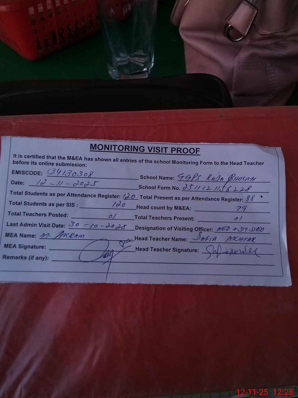 | EMIS Code: 34130308 | Name of School: GGPS RAJA BULLA | |||