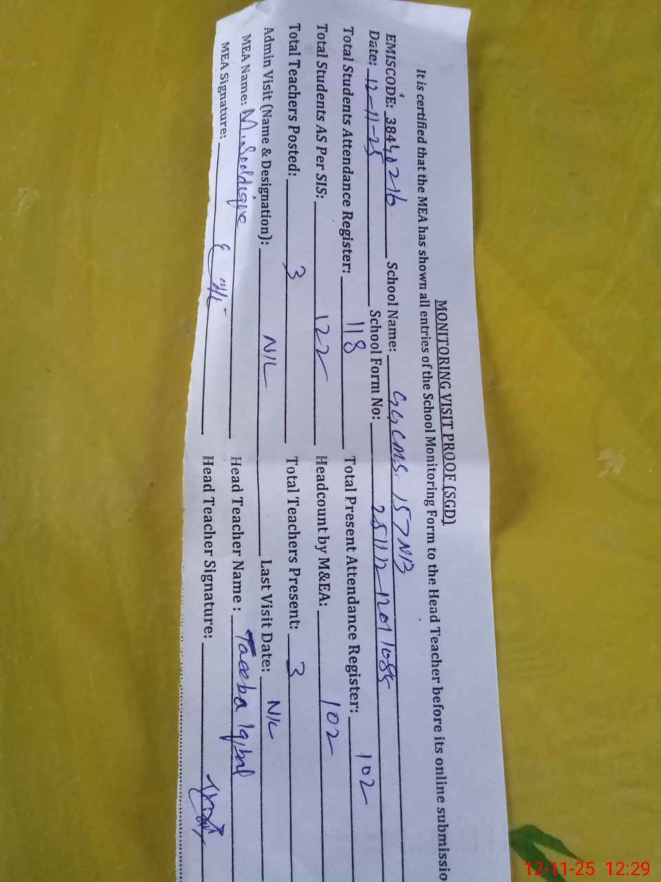 | Attendance Register | Head Teacher | MEA with School | Visit Proof |