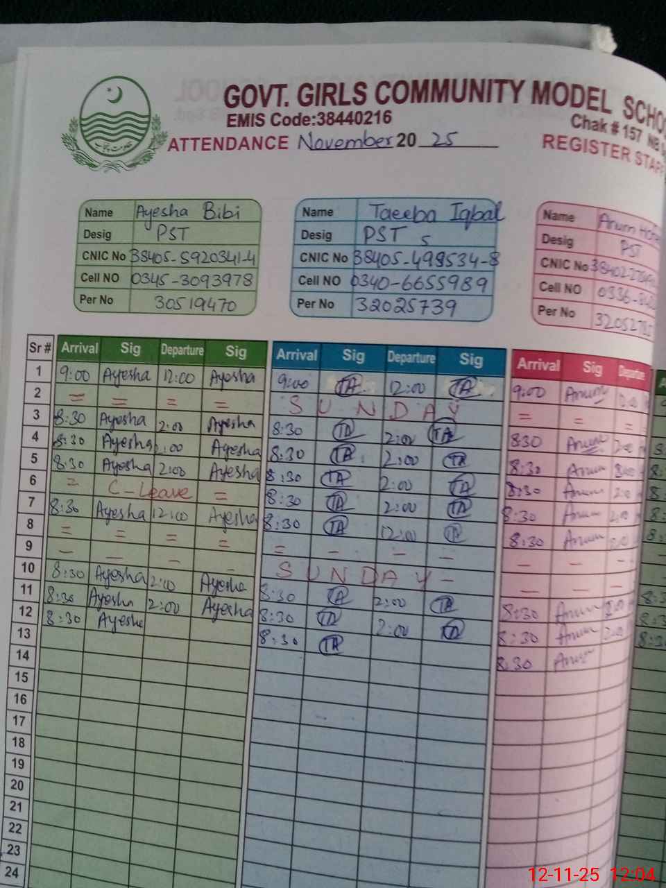 | CNIC | Full Name | Designation | R/C | Absence During Last Calender Month |