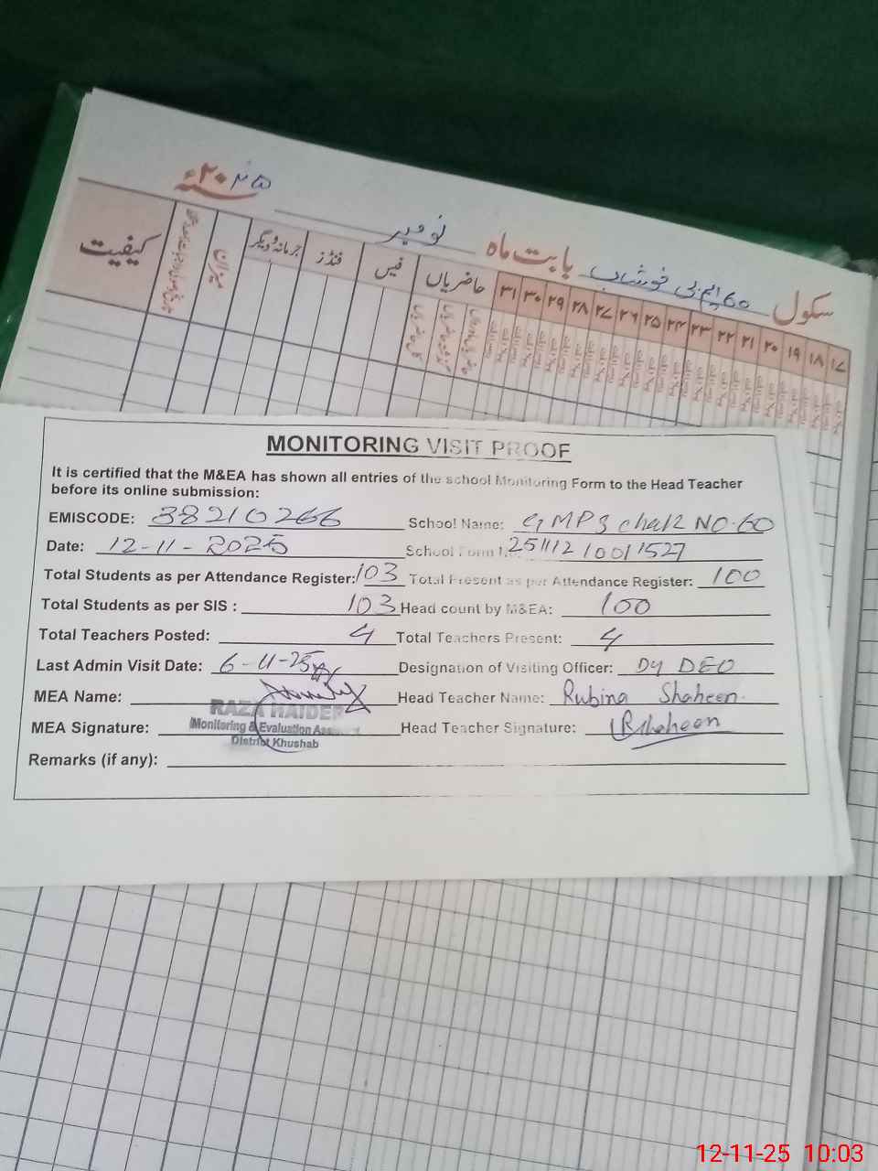 | Remarks (Use Separate Page if Required): Dy DEO visted 6 Nov 25 | |||||