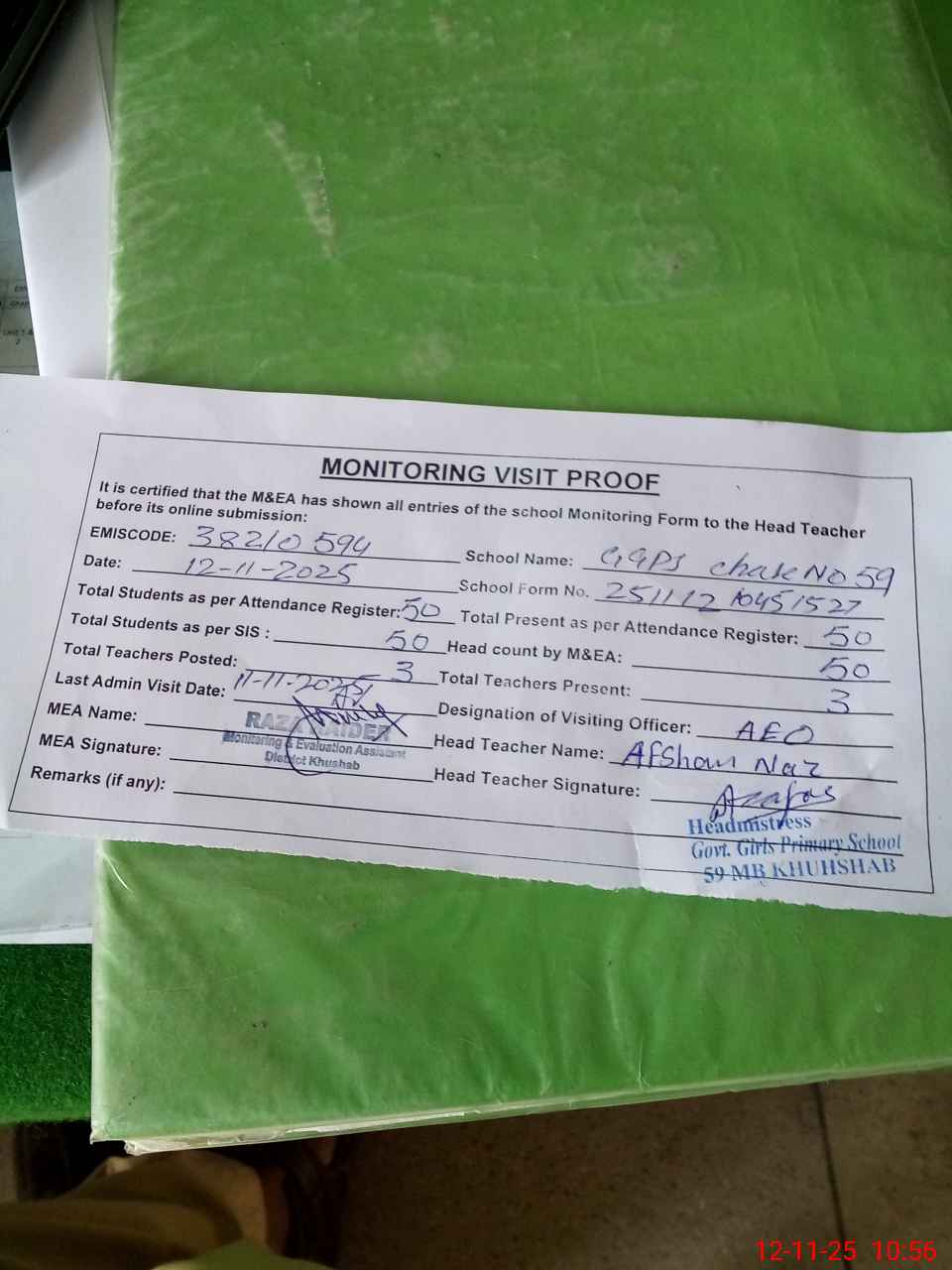 | Attendance Register | Head Teacher | MEA with School | Visit Proof |