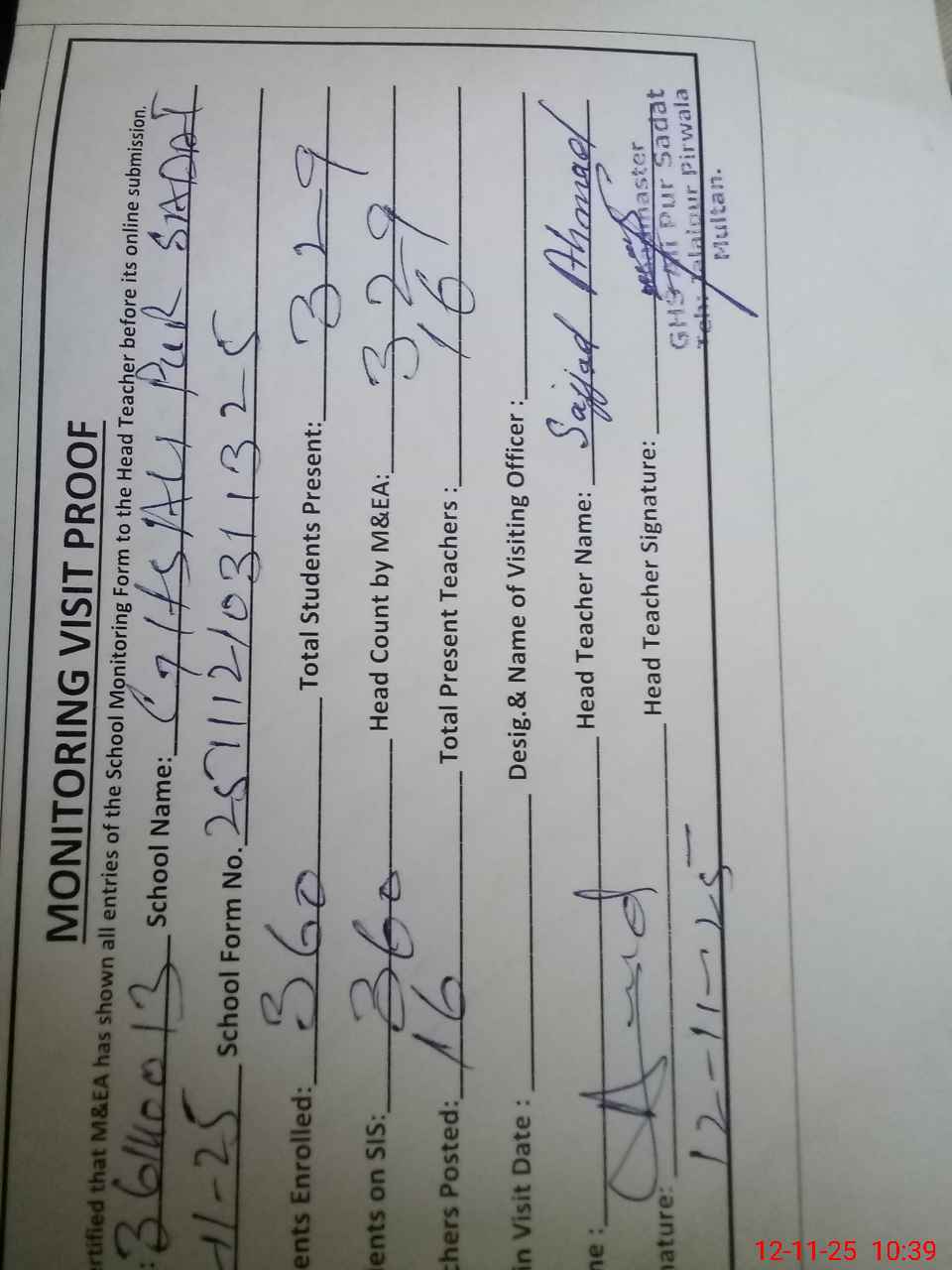 | Attendance Register | Head Teacher | MEA with School | Visit Proof |