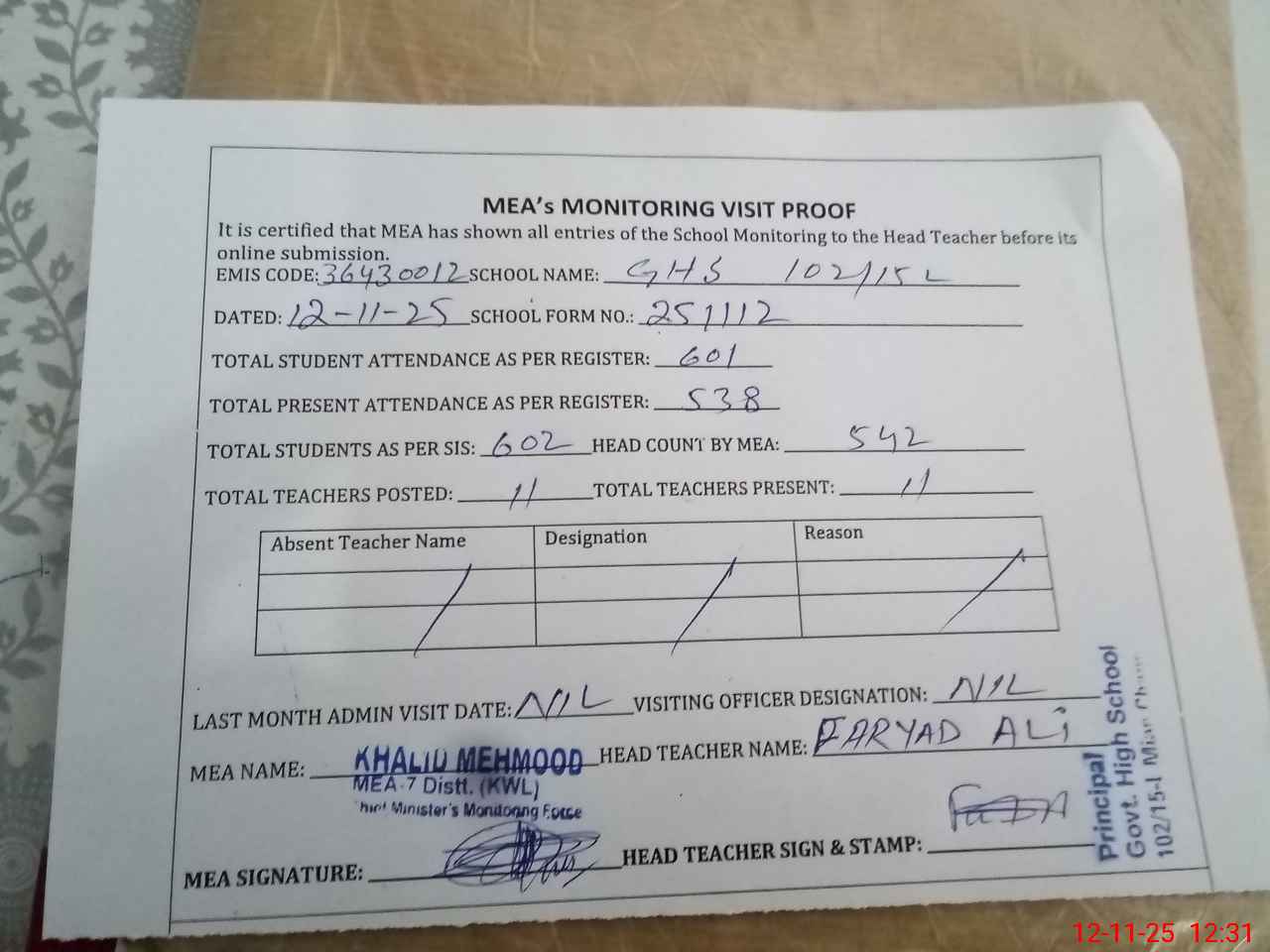 | Attendance Register | Head Teacher | MEA with School | Visit Proof |