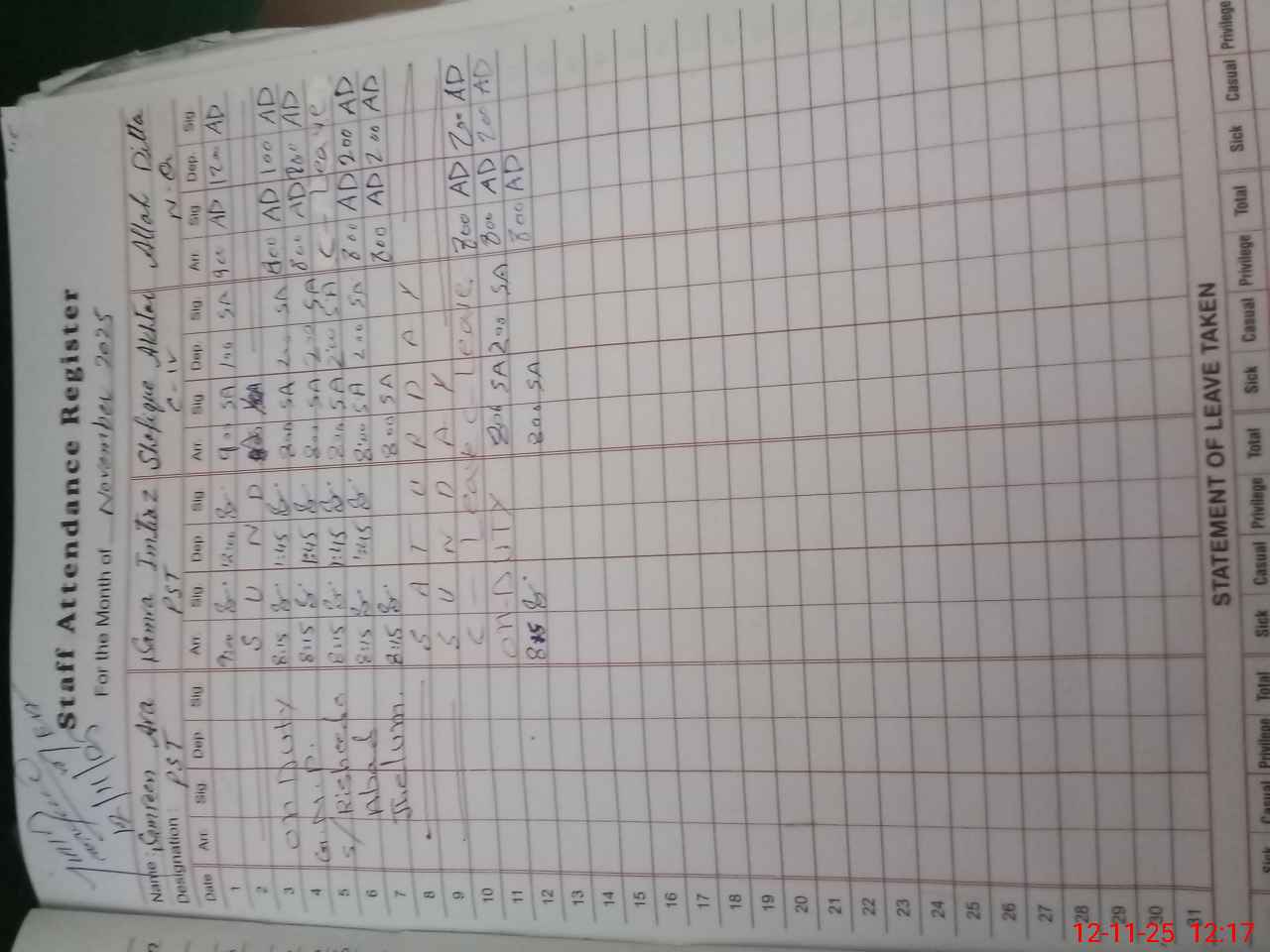 | CNIC | Full Name | Designation | R/C | Absence During Last Calender Month |