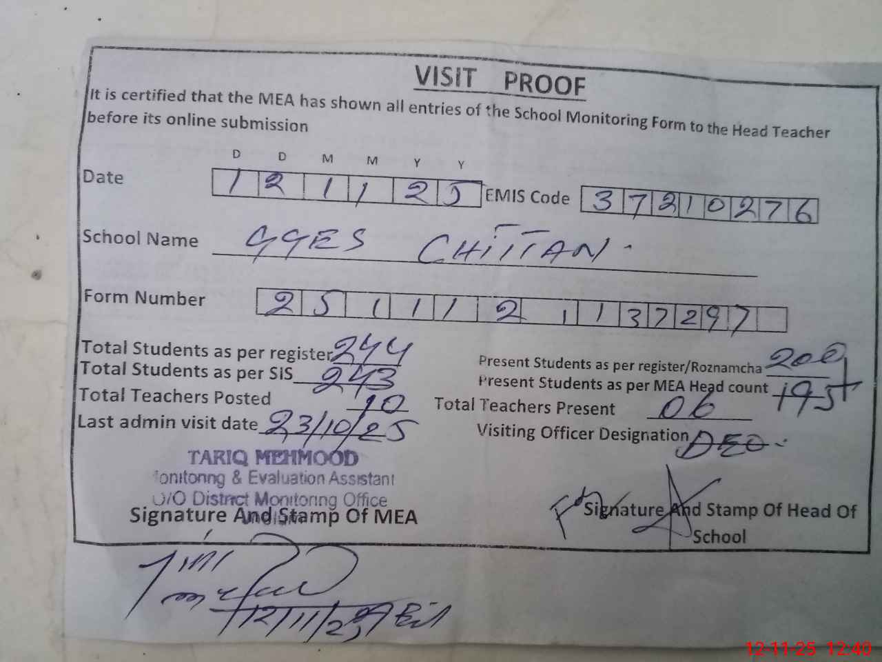 | Certified that this School was Inspected by the Undersigned MEA/DMO Today and the Information Stated Above is as Per Record. | |||||