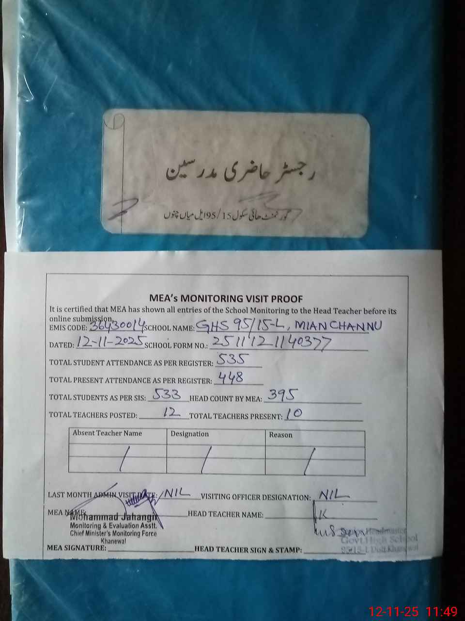 | Attendance Register | Head Teacher | MEA with School | Visit Proof |