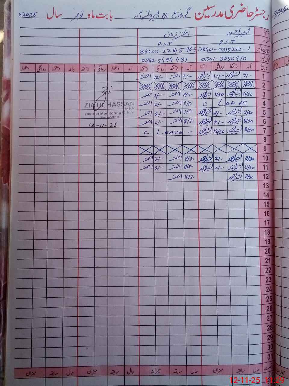 | CNIC | Full Name | Designation | R/C | Absence During Last Calender Month |