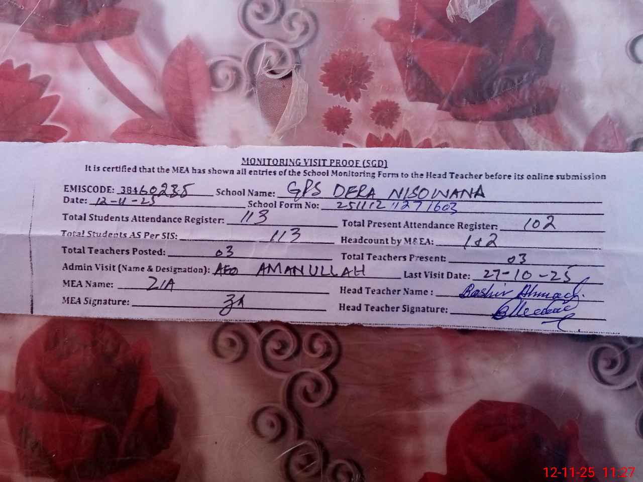 | Attendance Register | Head Teacher | MEA with School | Visit Proof |