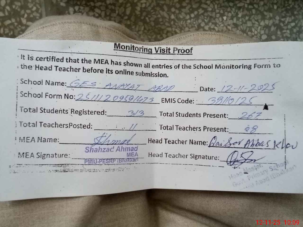 | EMIS Code: 38110125 | Name of School: GES ANAYAT ABAD | |||