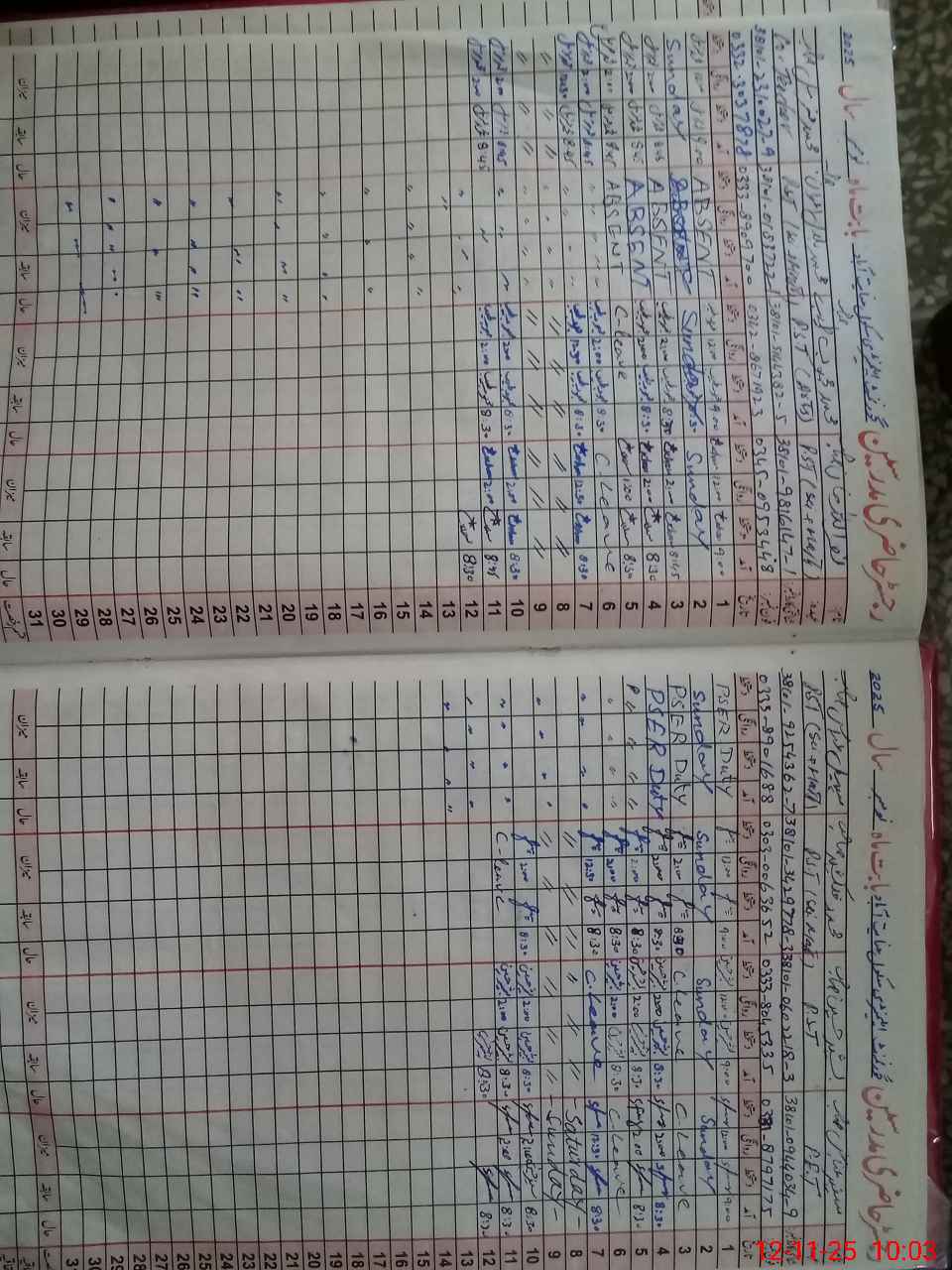 | Remarks (Use Separate Page if Required): Last visit Akhtar Sandhila DEO EE 28 October 2025 PST Muhammad Bilal Awan is absent since 30 August 2024 | |||||
