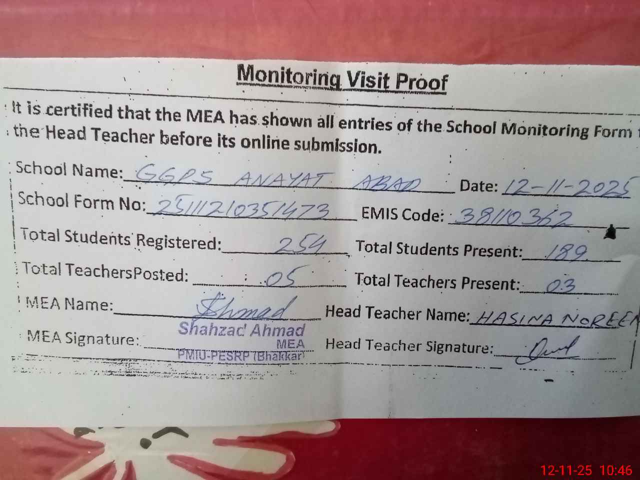 | EMIS Code: 38110362 | Name of School: GGPS ANAYAT ABAD | |||