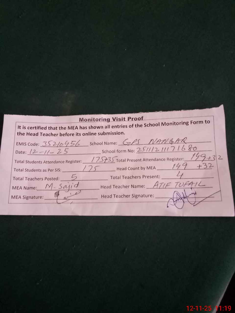 | Attendance Register | Head Teacher | MEA with School | Visit Proof |