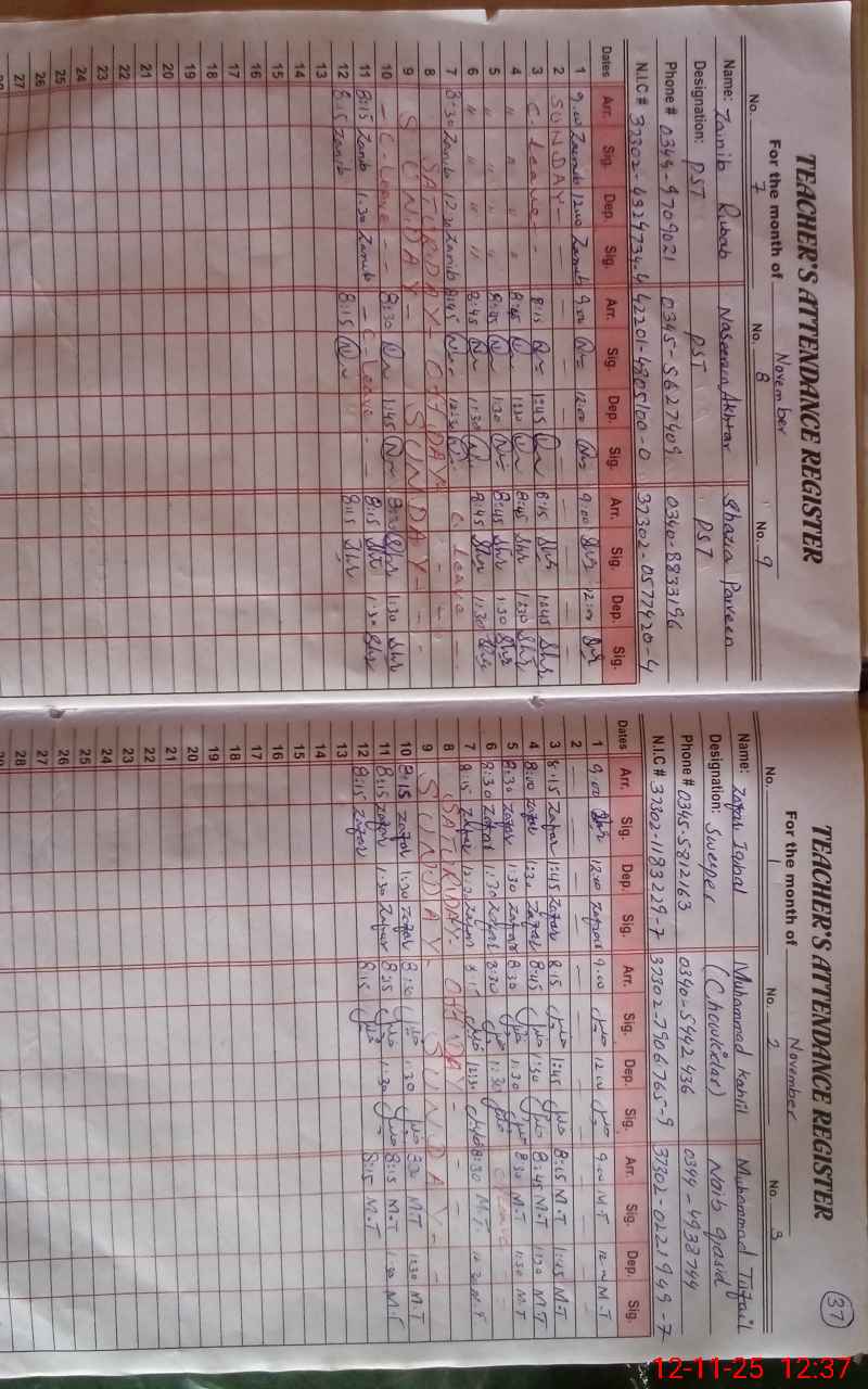| CNIC | Full Name | Designation | R/C | Absence During Last Calender Month |
