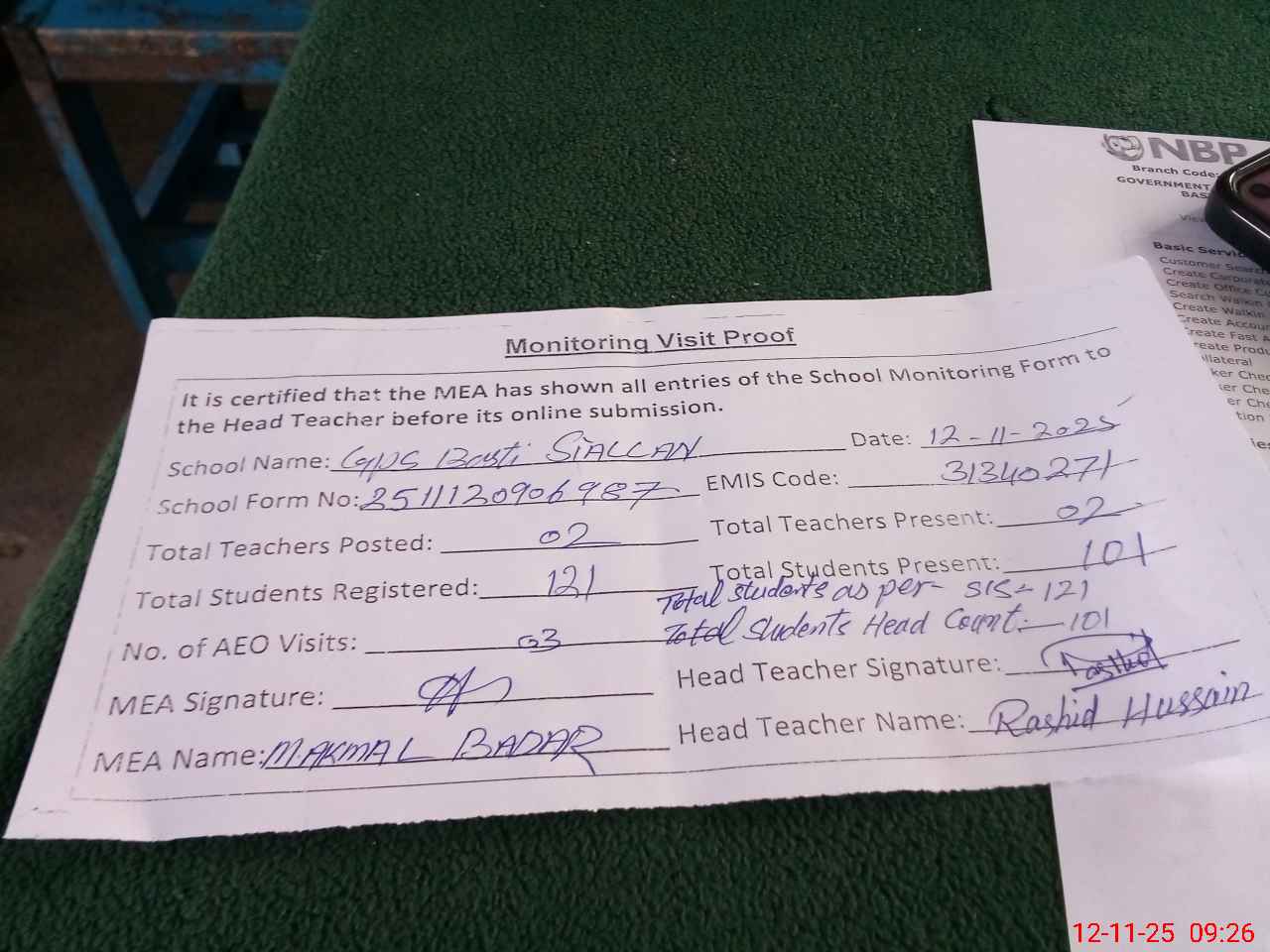 | Attendance Register | Head Teacher | MEA with School | Visit Proof |