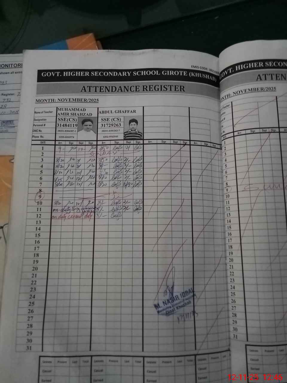 | CNIC | Full Name | Designation | R/C | Absence during last cal. month |