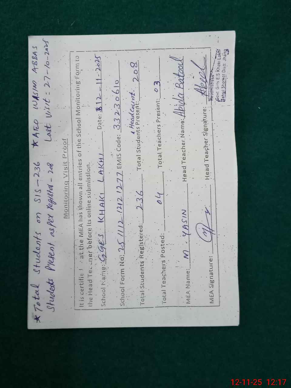 | Attendance Register | Head Teacher | MEA with School | Visit Proof |