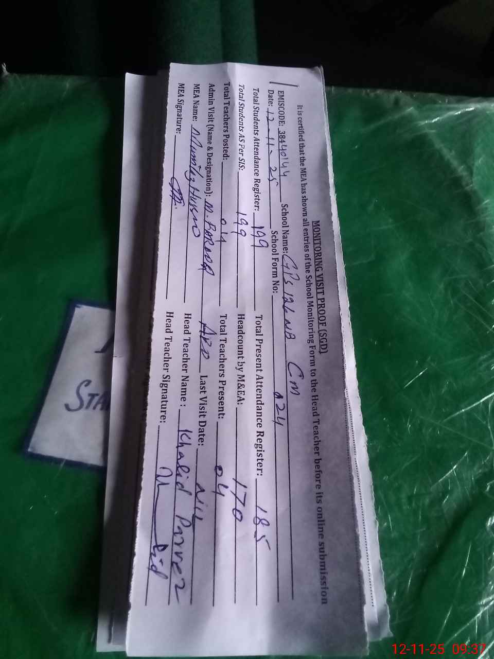 | Attendance Register | Head Teacher | MEA with School | Visit Proof |
