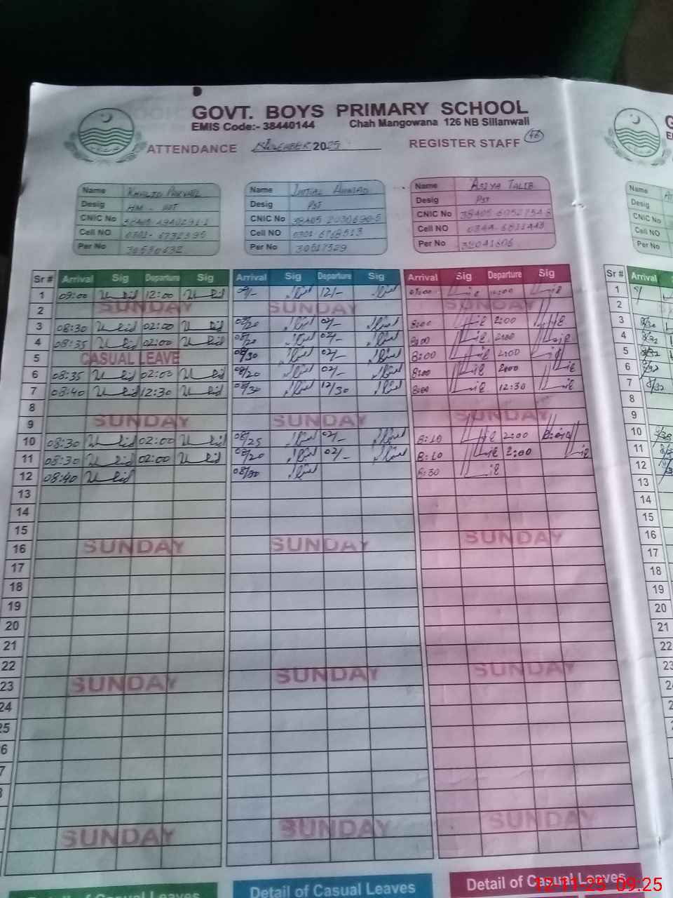 | CNIC | Full Name | Designation | R/C | Absence during last cal. month |