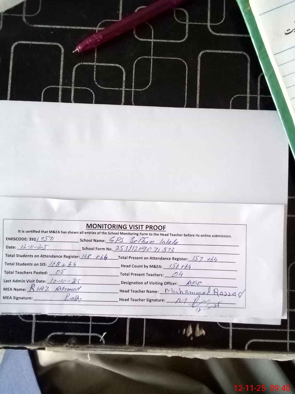 | Attendance Register | Head Teacher | MEA with School | Visit Proof |