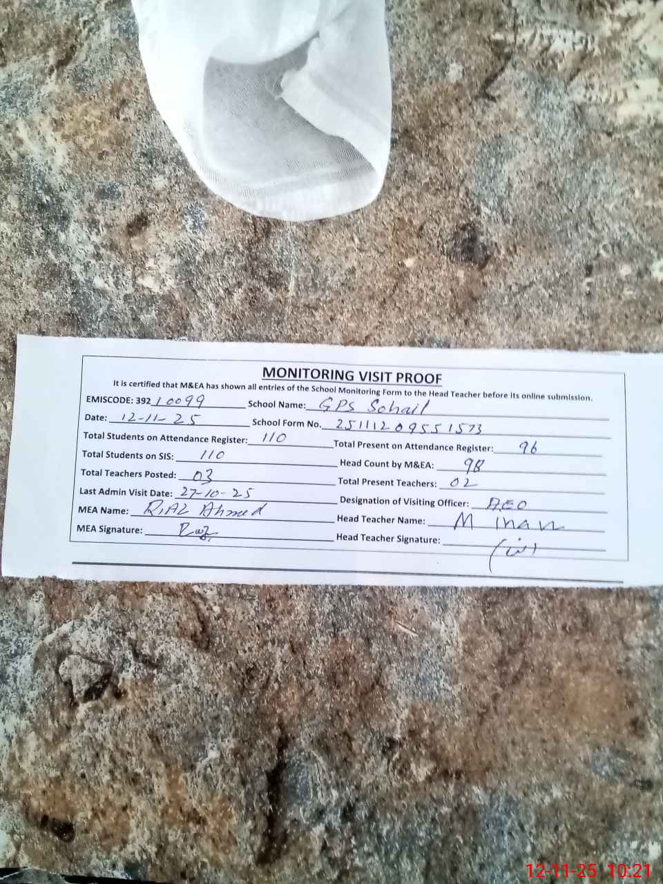 | Attendance Register | Head Teacher | MEA with School | Visit Proof |