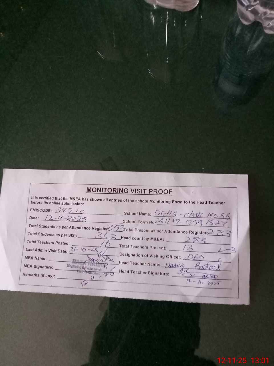 | Attendance Register | Head Teacher | MEA with School | Visit Proof |