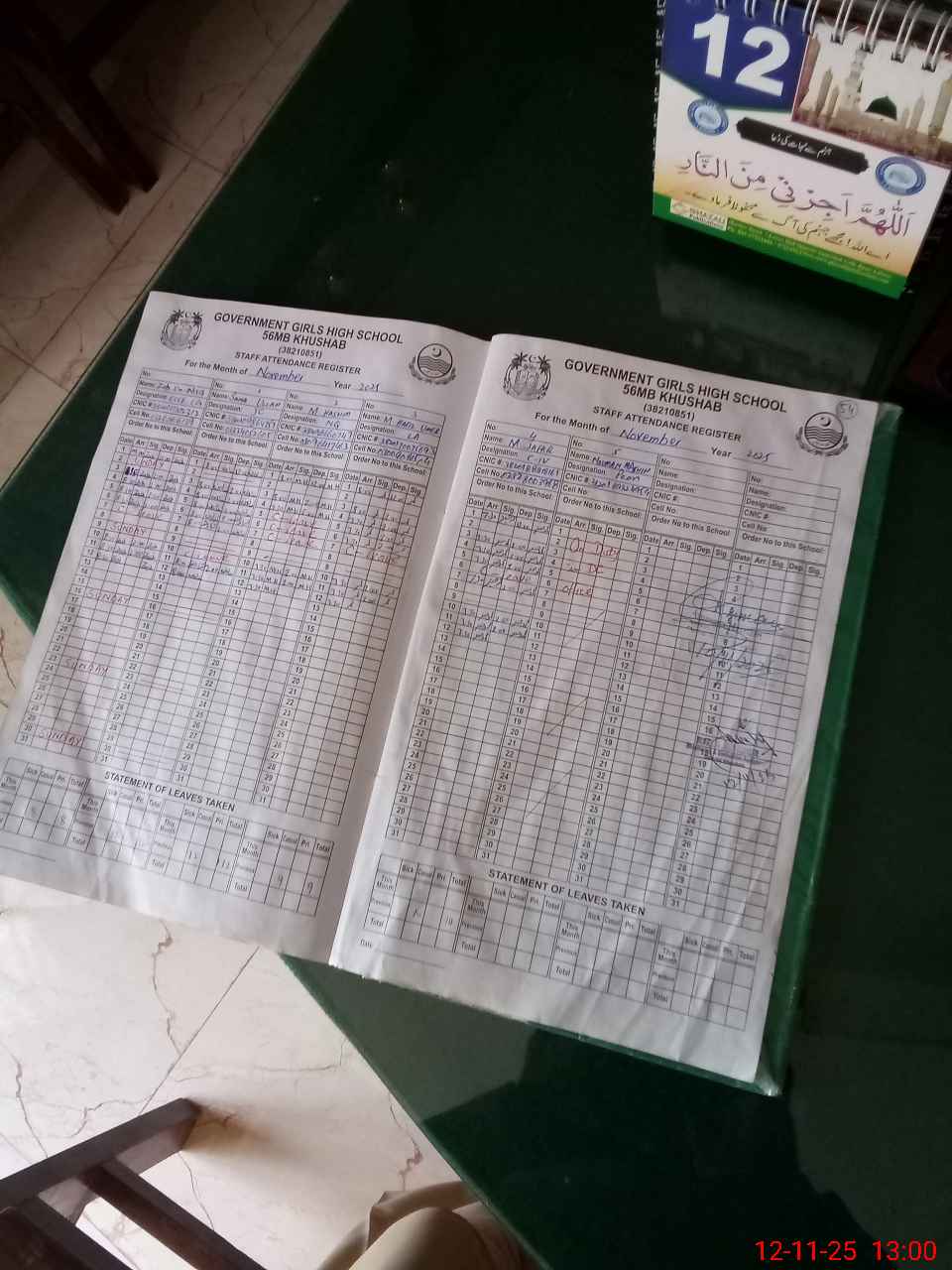 | CNIC | Full Name | Designation | R/C | Absence During Last Calender Month |