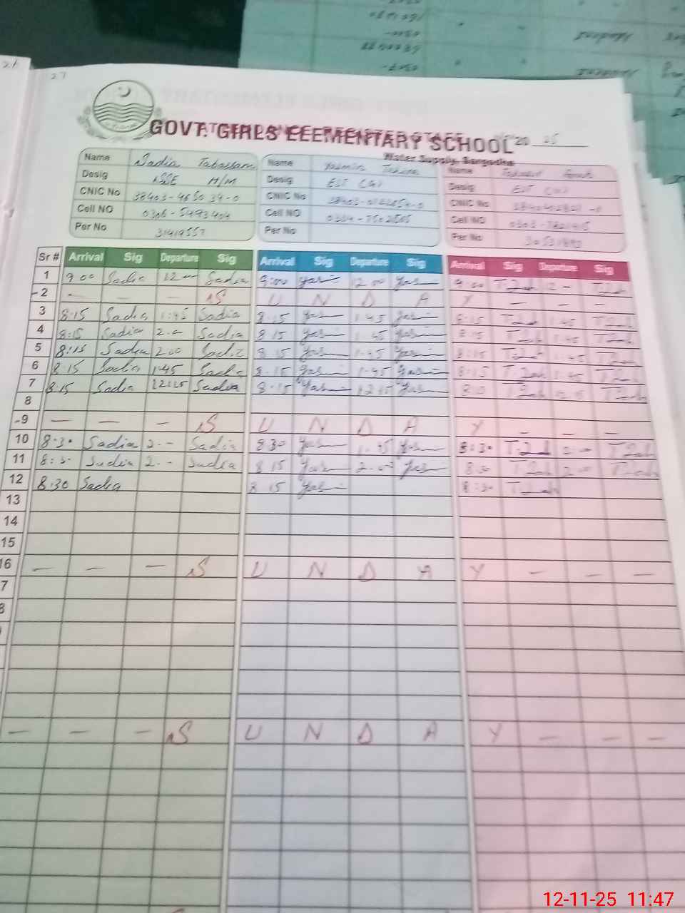 | CNIC | Full Name | Designation | R/C | Absence During Last Calender Month |