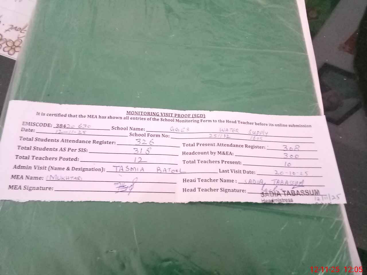 | Attendance Register | Head Teacher | MEA with School | Visit Proof |