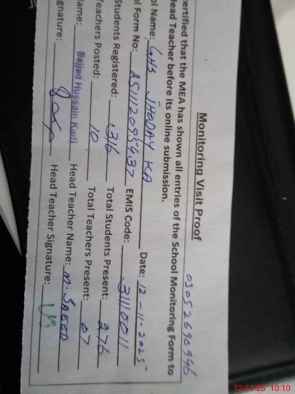 | Monitoring Date: 12-11-2025 | Start Time: 12-11-2025 09:40 AM | End Time: 12-11-2025 10:11 AM | Name of MEA: Sa**** Hu**** Ka**** BN**** 17 | |