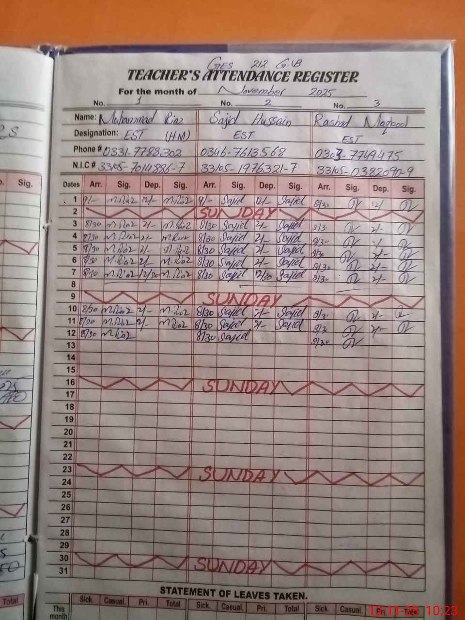 | CNIC | Full Name | Designation | R/C | Absence During Last Calender Month |
