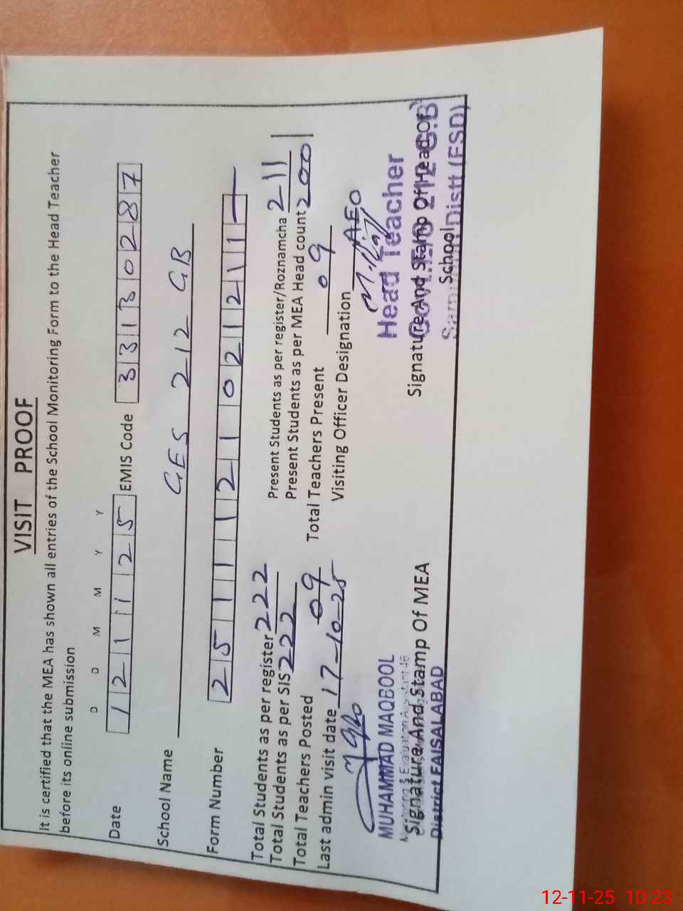 | Attendance Register | Head Teacher | MEA with School | Visit Proof |