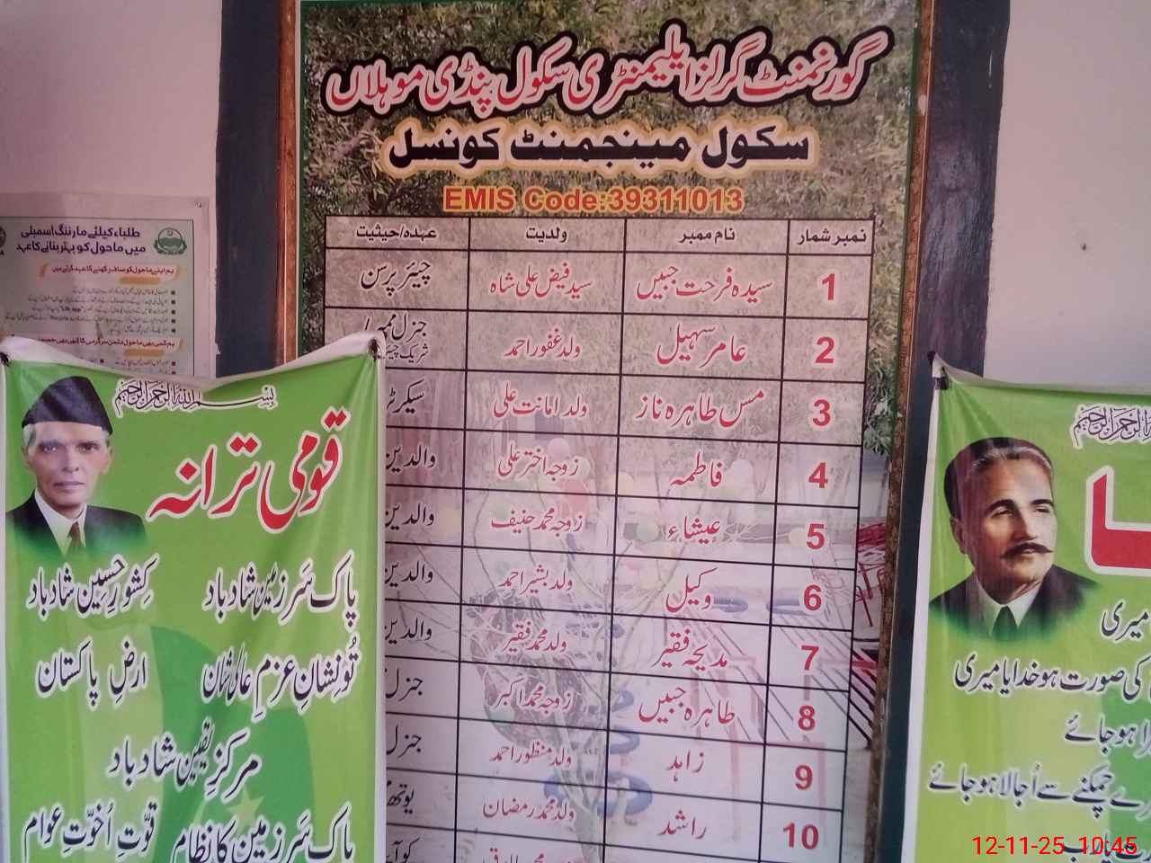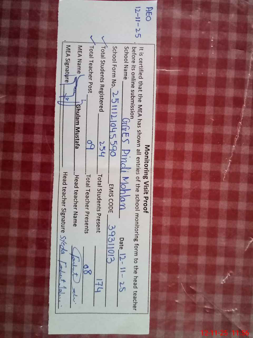 | EMIS Code: 39311013 | Name of School: GGES CHAK PINDI MOHLAN | |||