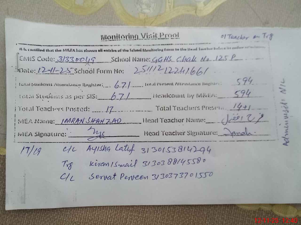 | Monitoring Date: 12-11-2025 | Start Time: 12-11-2025 11:55 AM | End Time: 12-11-2025 12:41 PM | Name of MEA: Im**** Sh**** | |