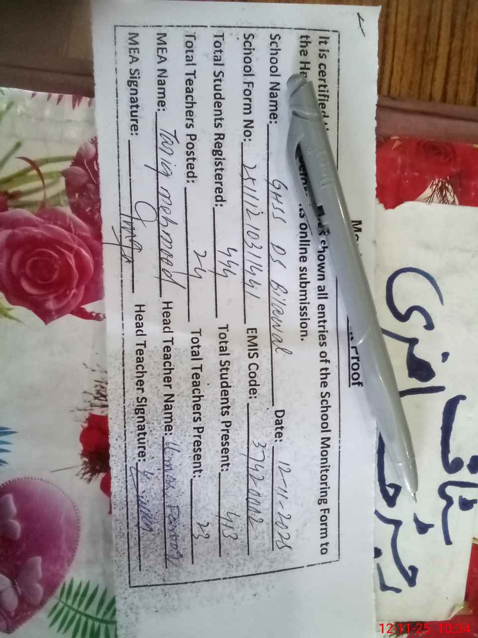 | Name: Um**** Fa**** Designation: (School Headmaster's/Headmistress's) PRINCIPAL Phone/Cell Number: 03**** |