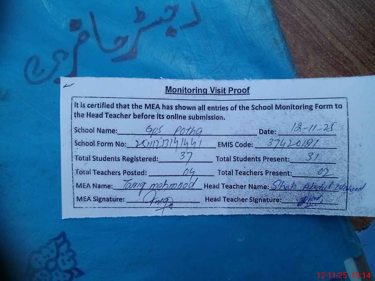 | Attendance Register | Head Teacher | MEA with School | Visit Proof |