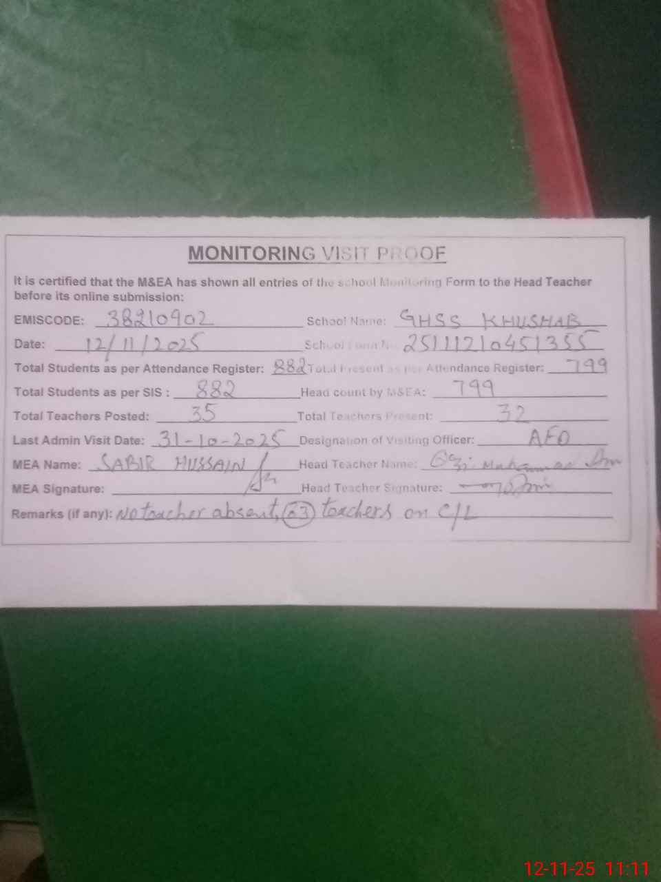 | Remarks (Use Separate Page if Required): No teacher absent 03 teachers on leave Last admin visit by AEO on 31 Oct 2025 | |||||