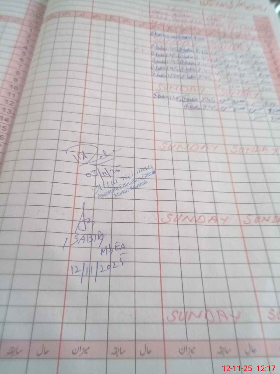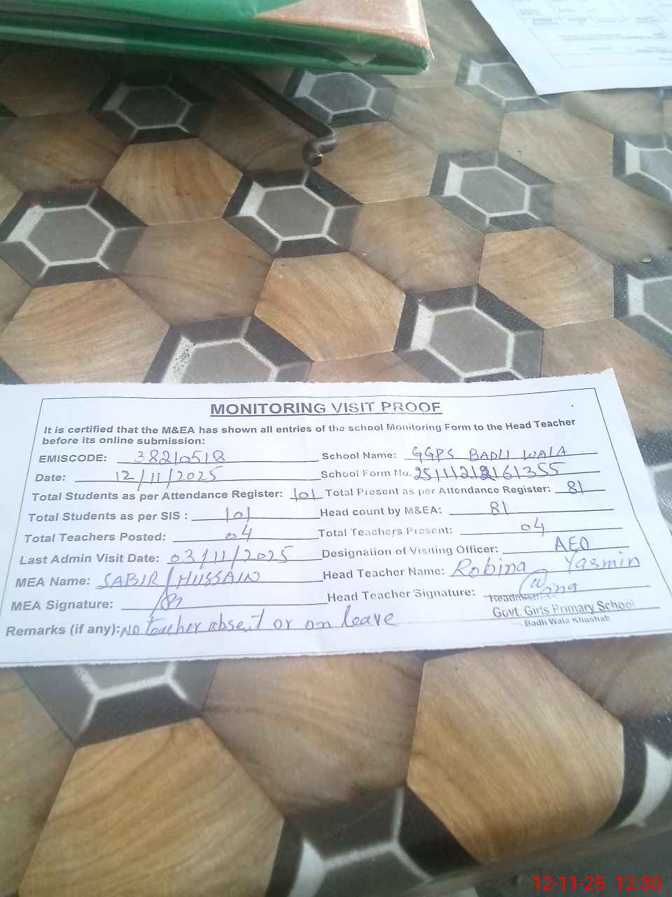 | Remarks (Use Separate Page if Required): No teacher absent No teacher on leave Last admin visit by AEO on 03 Nov 2025 | |||||
