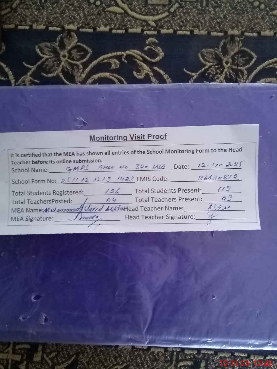 | Attendance Register | Head Teacher | MEA with School | Visit Proof |