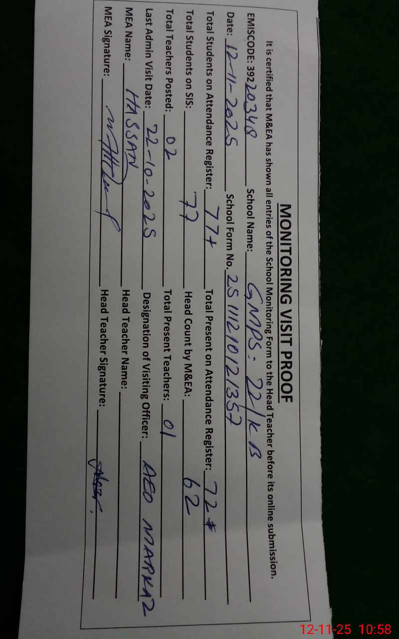 | EMIS Code: 39220348 | Name of School: GMPS 22 KB P/O MACHI SINGHTEH | |||