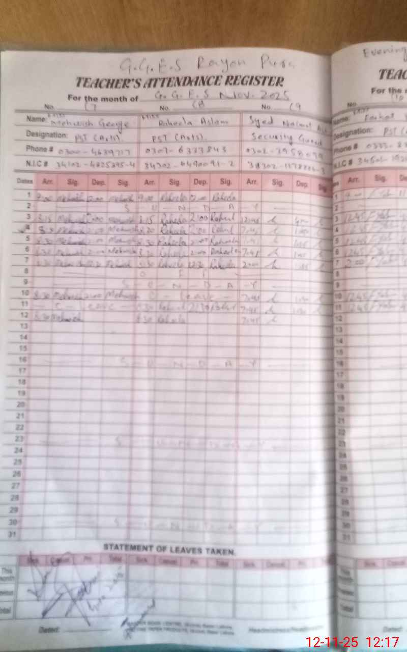 | CNIC | Full Name | Designation | R/C | Absence During Last Calender Month |
