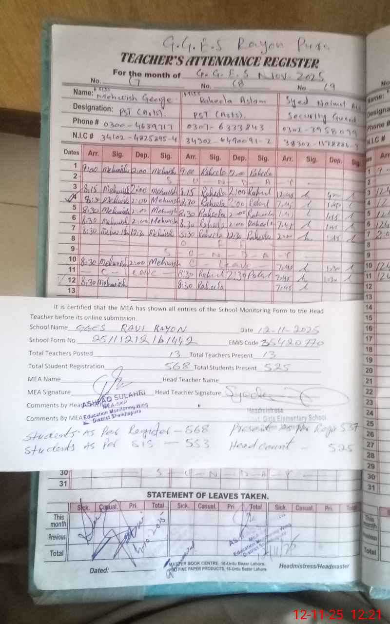 | Attendance Register | Head Teacher | MEA with School | Visit Proof |