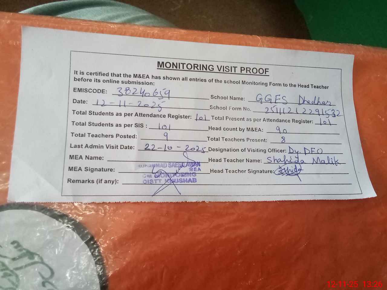 | Remarks (Use Separate Page if Required): Students on SIS QTY 101 Last admin visit On 22 October 2025 by DY DEO | |||||