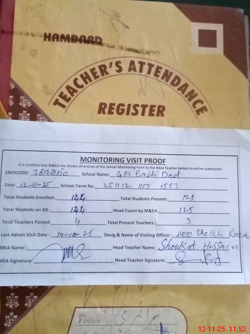 | Attendance Register | Head Teacher | MEA with School | Visit Proof |