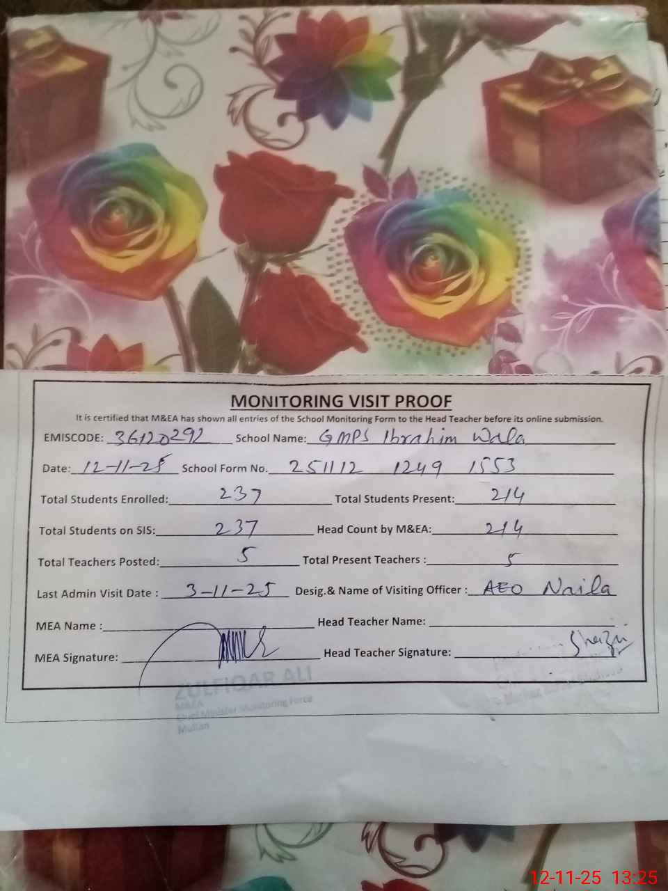 | Attendance Register | Head Teacher | MEA with School | Visit Proof |