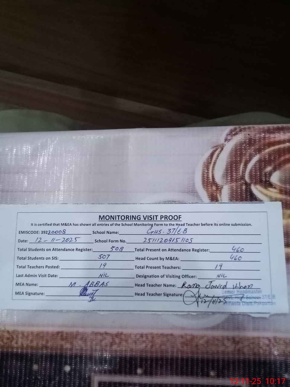 | Monitoring Date: 12-11-2025 | Start Time: 12-11-2025 09:15 AM | End Time: 12-11-2025 10:18 AM | Name of MEA: Mu**** Ab**** | |