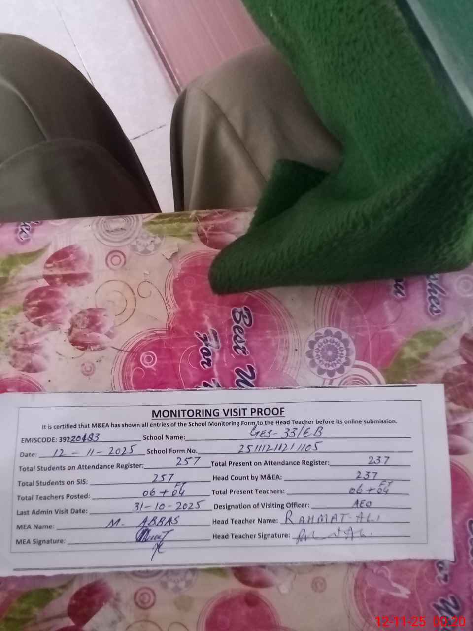 | Attendance Register | Head Teacher | MEA with School | Visit Proof |